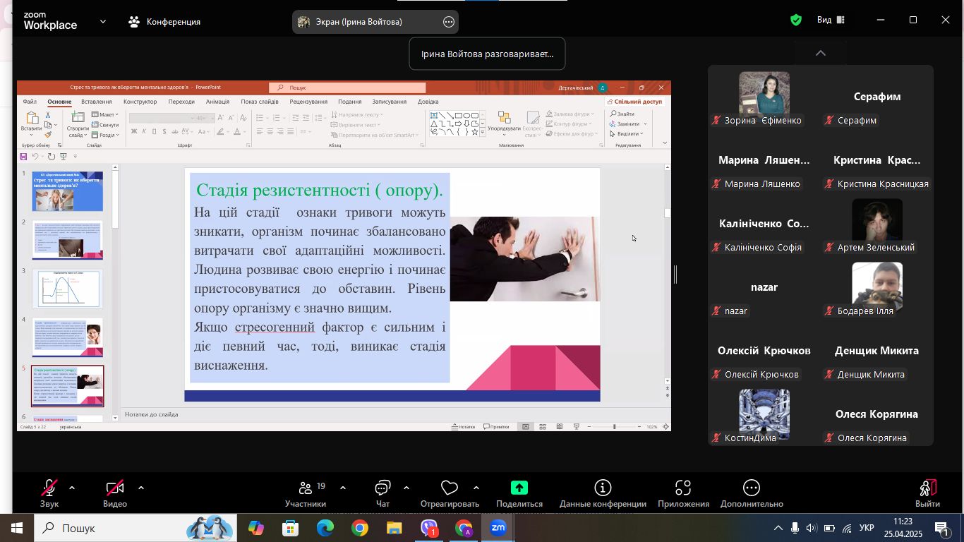 23 квітня, у Всеукраїнський день психолога, вчительська та учнівська спільноти КЗ "Дергачівський ліцей № 4" разом із соціальним педагогом Войтовою І. Ю. долучилися до години спілкування "Стрес та тривога: як вберегти ментальне здоров'я?"