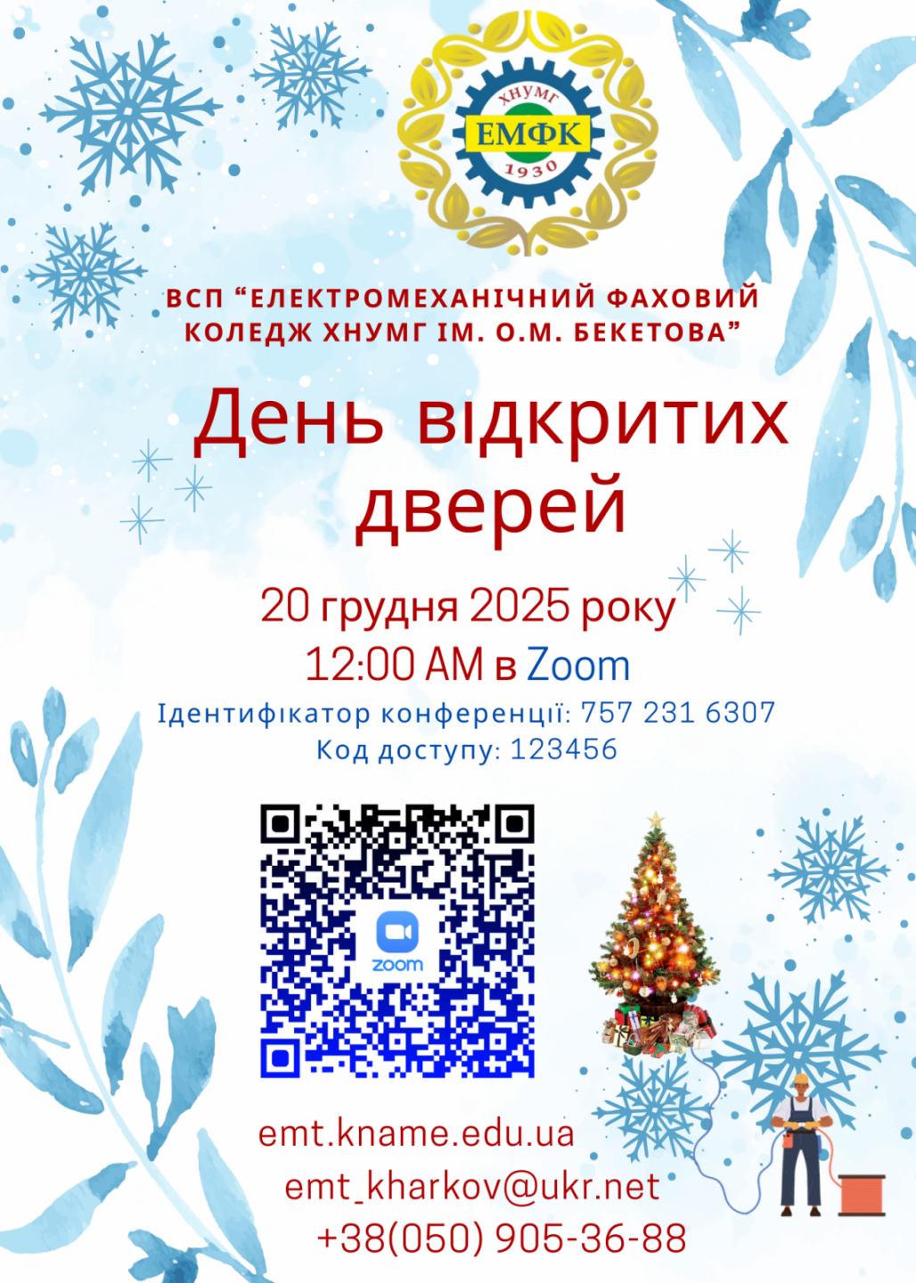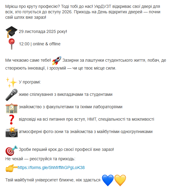 Запрошуємо учнів старших класів на День відкритих дверей фізичного факультету Київського національного університету імені Тараса Шевченка, що відбудеться у форматі онлайн-зустрічі на платформі Zoom в суботу, 22 листопада 2025 року, початок об 11:00. Для участі в заході необхідно пройти попередню реєстрацію за адресою: https://surl.li/nnjjfi.