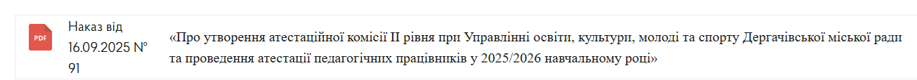 У КЗ "Дергачівський ліцей №4" Дергачівської міської ради не створена атестаційна комісія І рівня, бо працють 11 педагогічних працівників, тому згідно Положенню про атестацію педагогічних працівників, затвердженої наказом МОН України №805 від 09.09.2022 року (зі змінами) "Про затвердження Положення про атестацію педагогічних працівників", педагогічні працівники ліцею атестуються комісією ІІ рівня при Управлінні ОКМС Дергачівської міської ради. Наказ.